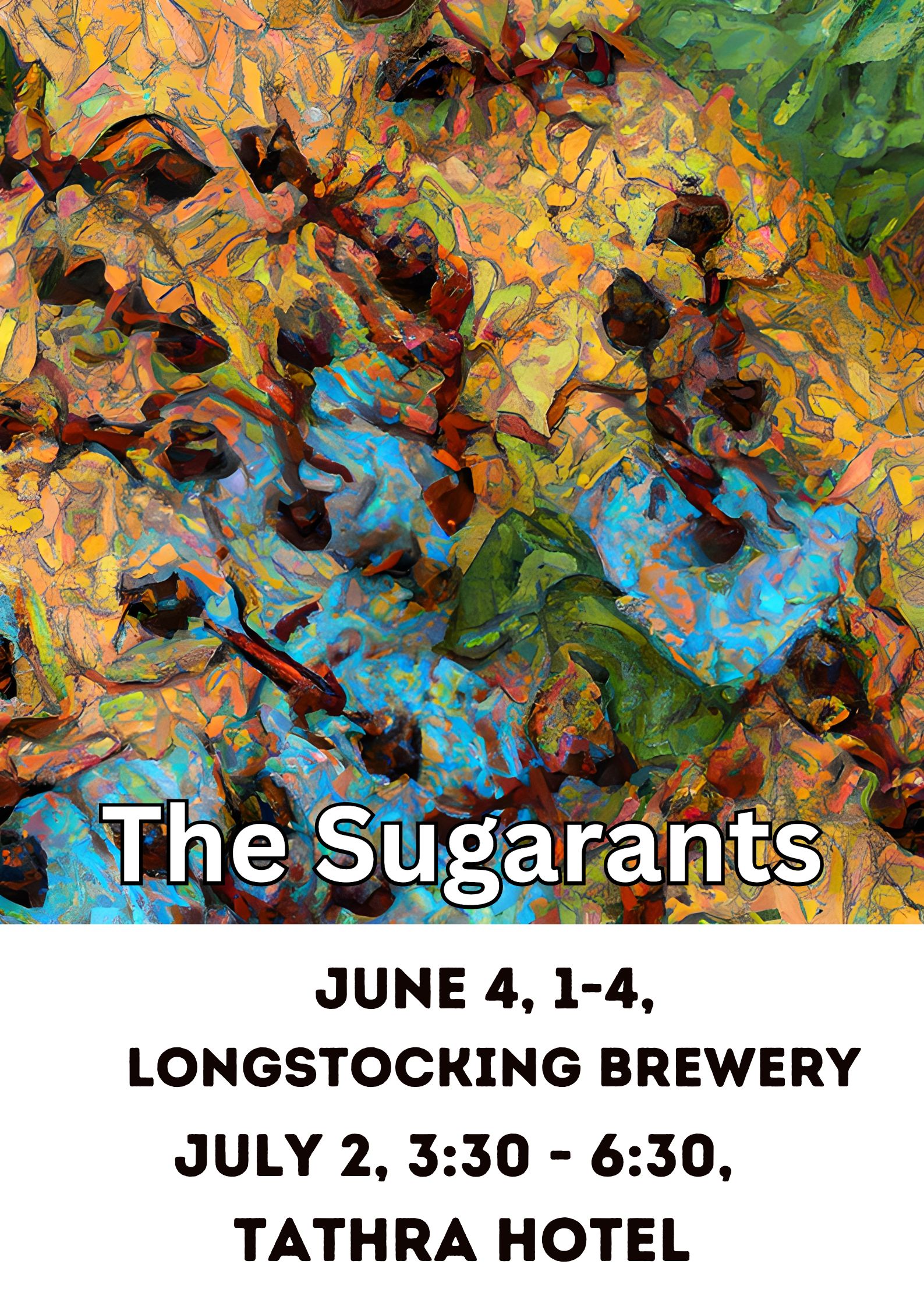 WinterSun Merimbula, 2021: Sam Martin, Trapper, Jamie, RikkyBecky setting up, Longstocking 21/5/2021Rock for Rocky, Wyndham, March 2021.The Sugarants, Longstocking Brewery, 27/12/2020: Trapper Trelven, Dennis Milsom, Erik Rijnberg, Jamie Forbes.Pambula-Merimbula Golf Club, 6/3/2020Longstocking Brewery, Pambula, December 2019Bemboka Showground, 12/10/2019